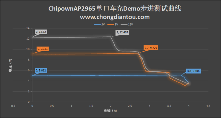 步進(jìn)測(cè)試分為5V/9V/12V三種模式:5V模式下空載電壓5.01V,最大步進(jìn)電流3.8A,最大功率19W;9V模式下空載電壓9.14V,最大步進(jìn)電流2.7A,最大功率達(dá)到25W;12V模式空載電壓12.32V,最大輸出功率為24.8W,當(dāng)電流達(dá)到2A后進(jìn)入降壓保護(hù)。從曲線可以看出,在5V時(shí)的恒流點(diǎn)為3.9A;在9V時(shí)的恒流點(diǎn)為2.8A,在12V輸出時(shí)的恒流點(diǎn)是2.1A。在QC3.0應(yīng)用時(shí),在輸出不同的電壓時(shí),AP2965自動(dòng)調(diào)節(jié)輸出的恒流點(diǎn)。