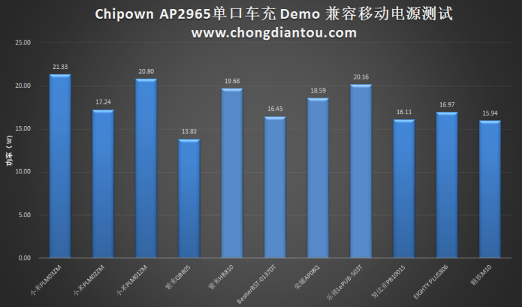 首諾信基于Chipown AP2965單口QC3.0車(chē)載充電器對(duì)幾款常見(jiàn)的移動(dòng)電源有著很好的兼容性和強(qiáng)大的輸出功率。小米PLM03ZM、小米PLM01ZM、樂(lè)視LePUB-503T充電功率均突破20W,對(duì)其余設(shè)備的輸出功率基本在15W以上。